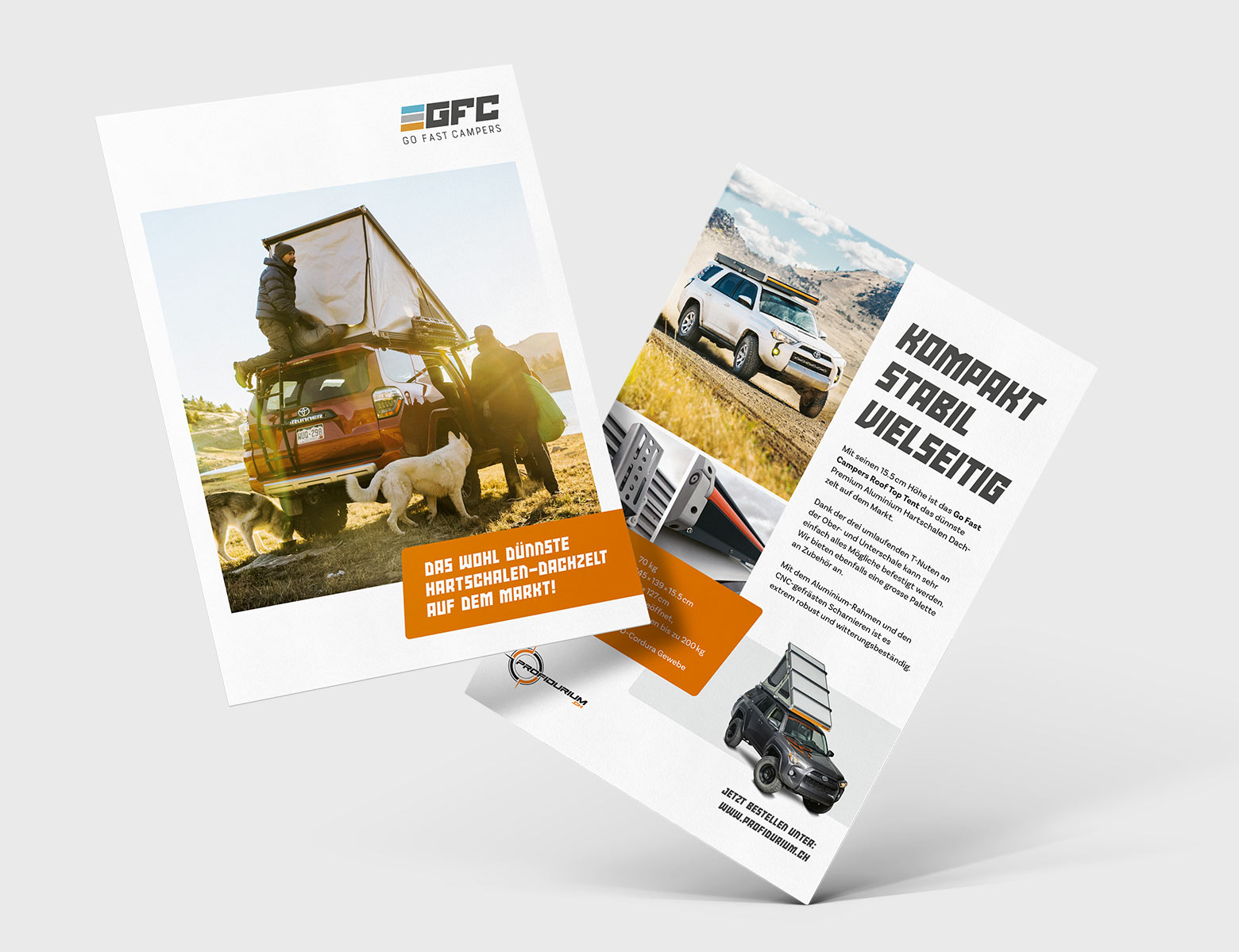 Profidurium (mit Sitz in der Zentralschweiz) ist europaweit der einzige Händler, der die Hartschalen-Dachzelte von GFC vertreibt. Für die Messe «Suisse Caravan Salon» in Bern durfte ich einen A5 Flyer designen, der die Vorzüge des Dachzelts zum Ausdruck bringen sollte.